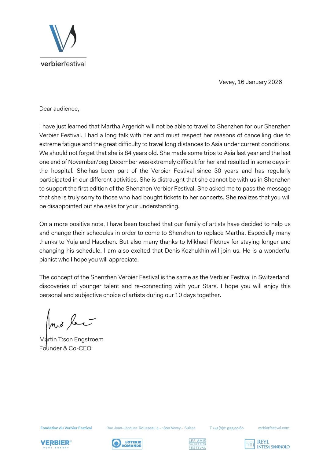 We have recently been informed that due to health reasons, Ms. Martha Argerich is unable to travel to Shenzhen for her performances. Upon receiving this news, the "Verbier Festival 2026 Shenzhen" team immediately initiated urgent communication with the Verbier Festival in Switzerland, striving to understand the artist's situation and working overnight to discuss contingency plans. Mr. Martin T:son Engstroem, Founder of the Verbier Festival, also departed promptly to visit Ms. Argerich and actively coordinate performance arrangements.
